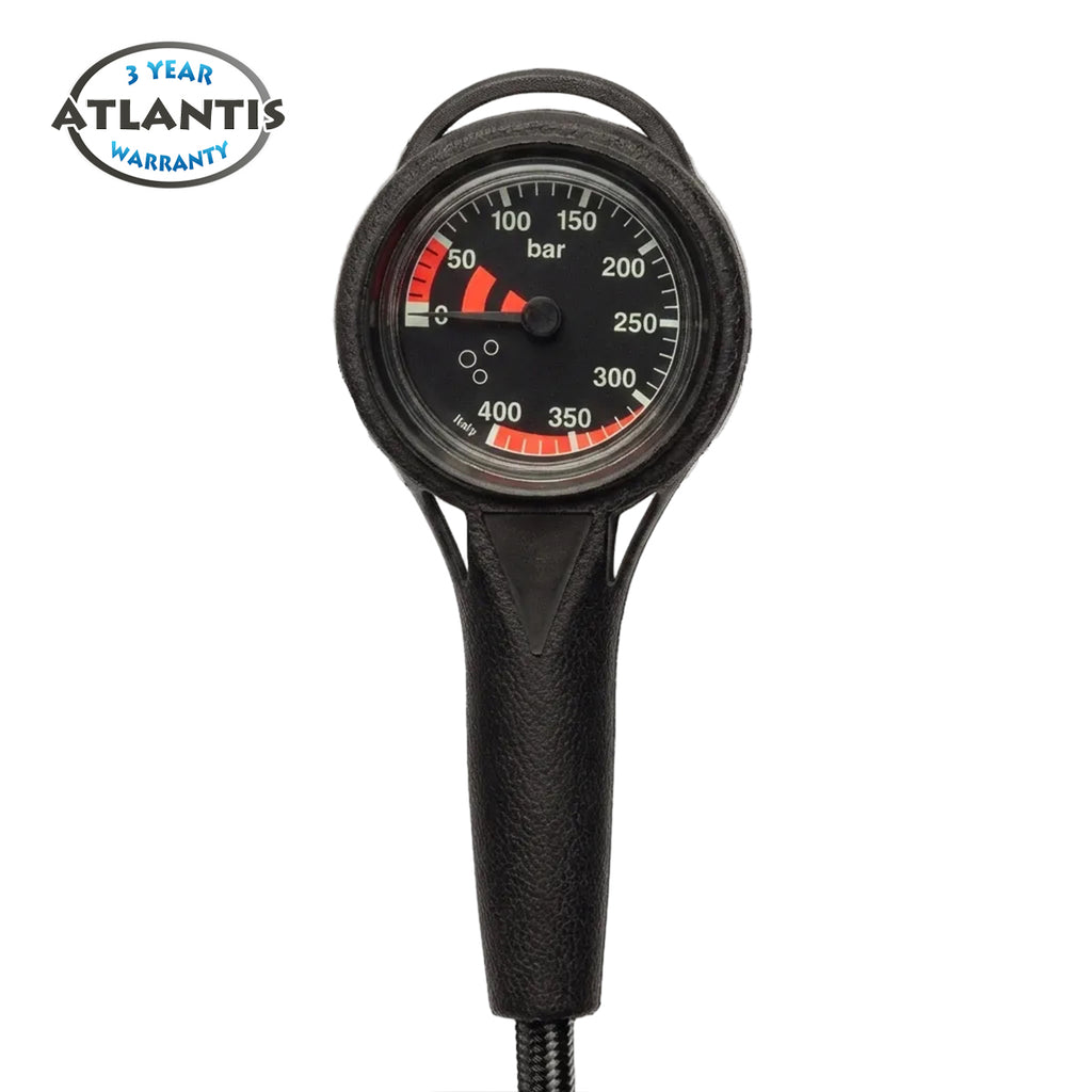 Le Manomètre 400 bar avec tuyau Miflex d'Atlantis est un manomètre compact et ergonomique. Le cadran lumineux phosphorescent monte jusqu'à 400 bars avec une indication à 50 bars. Le tuyau flexible haute pression Miflex mesure 80 cm de long.