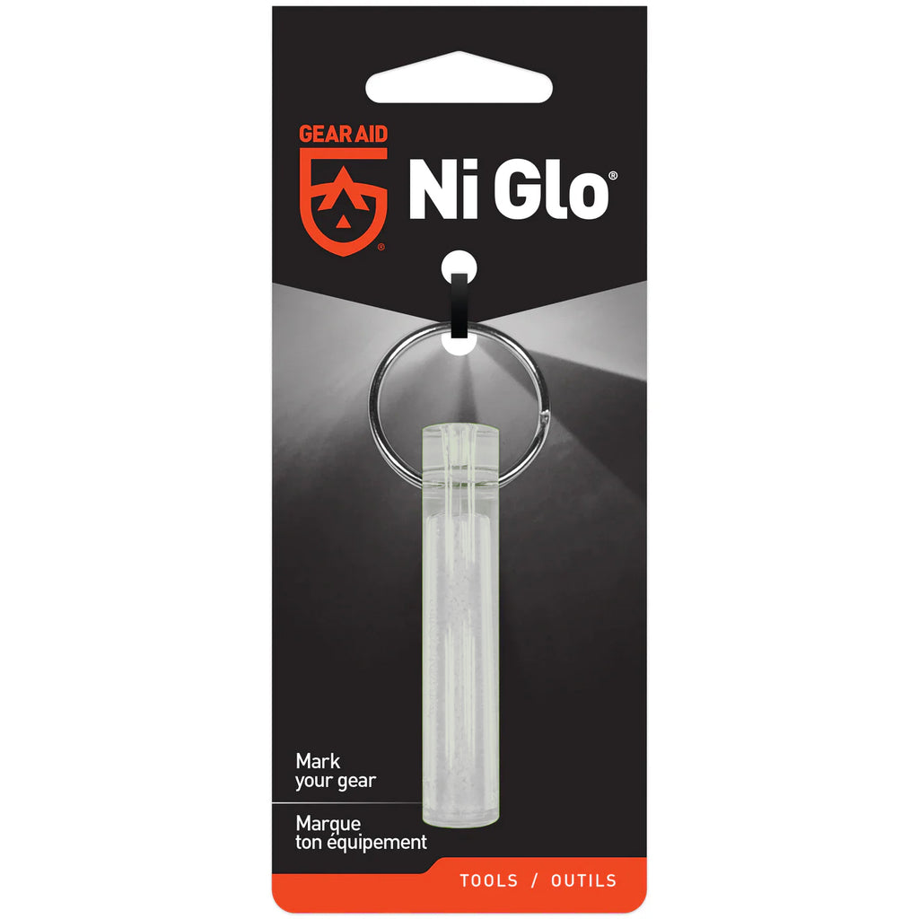 Ni-Glo™, un porte-clés qui brille dans le noir et peut être utilisé comme marqueur pour les clés et toutes sortes d'équipements de plein air. Ce porte-clés rechargeable est sans pile ni tritium. Ni-Glo™ se charge à la lumière du soleil ou à la lumière artificielle et brille vivement au début, mais s'estompe pour devenir une lueur constante visible toute la nuit.