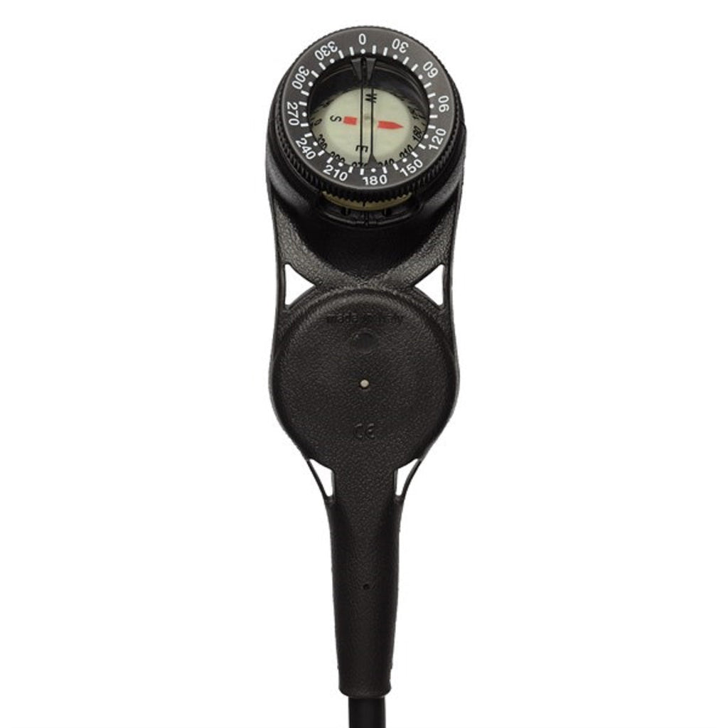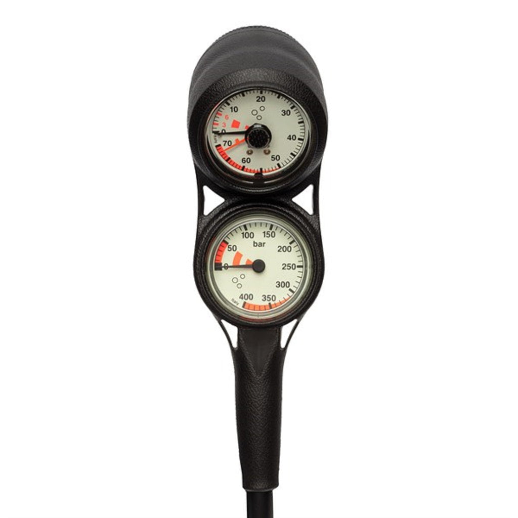 De Combo3 is een ideaal console met manometer, dieptemeter en een kompas op de achterzijde van de bovenste (diepte)meter. De heldere fosforescerende wijzerplaat gaat tot 400 bar met een 50 bar indicatie. De dieptemeter geeft diepte weer tot 70 meter en heeft een duidelijke afleesbare wijzerplaat. Standaard bijgeleverd is een rubberen slang (80 cm) en optioneel is flexibele Miflex slang.