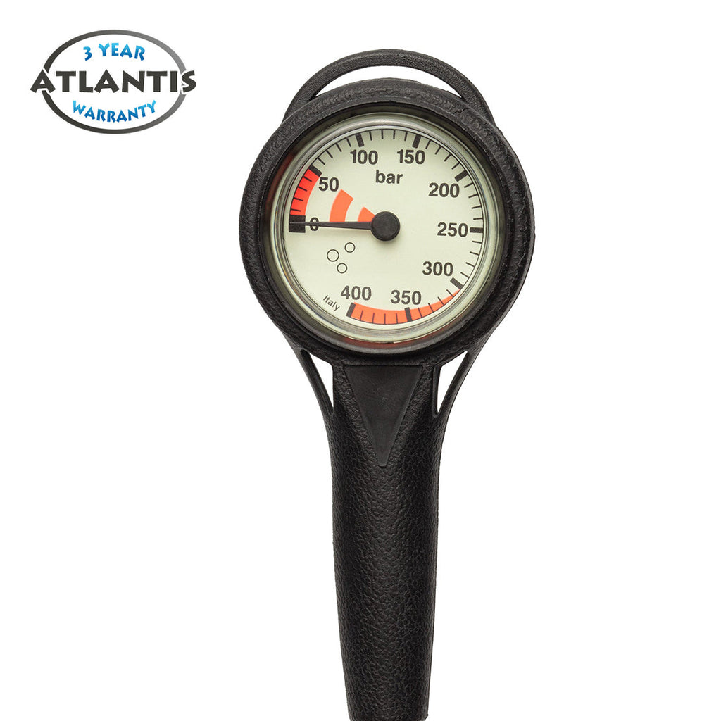 De Pressure Gauge 400 bar van Atlantis is een compacte, ergonomische manometer. De heldere fosforescerende wijzerplaat gaat tot 400 bar met een 50 bar indicatie. De 80cm lange hogedrukslang is gemaakt van rubber.